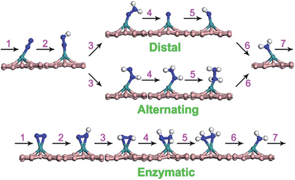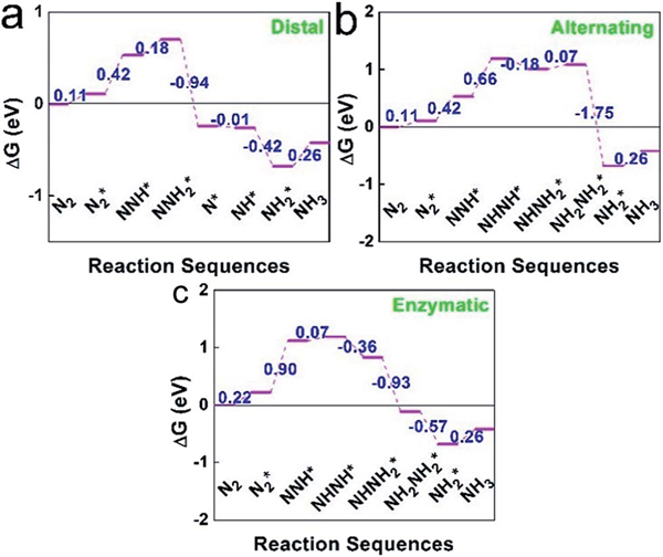 由Ru/Bβ催化的NRR的计算能量分布:(a)远端(b)交替和(c)酶促机制。