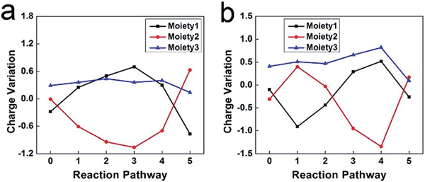 沿远端通路的三个部分的电荷波动步骤(a)Ru/Bα,(b)Ru/Bβ。步骤0表示在N2吸附过程中转移的电荷。