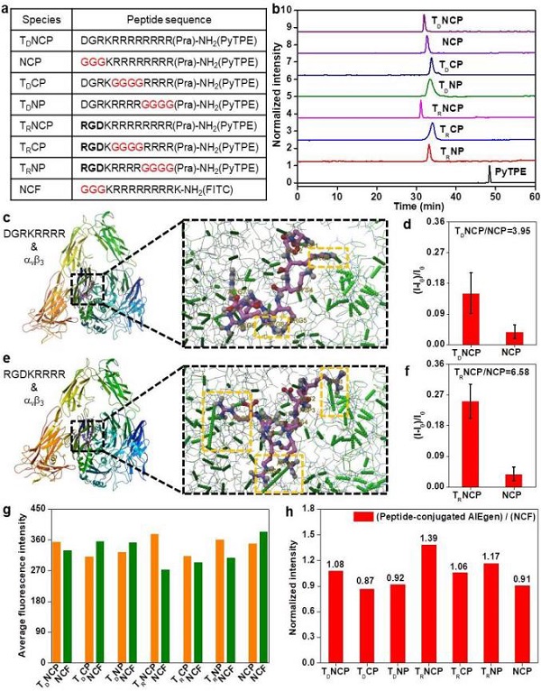 在这个工作中,作者利用多功能肽和AIEgen来实现有效和顺序靶向递送以及跟踪细胞核。通过整合素靶向肽、细胞渗透性肽和核定位序列的组合,TDNCP比其他衍生物显示出更优异的生物相容性、核选择性成像和光稳定性。与TDNCP/siRNA-NPs,lipo/ASONPs和lipo/siRNA-NPs相比,TDNCP/ASO-NPs在整合素过表达的细胞系中显示出优异的基因干扰效应。由于顺序和靶向细胞穿透,TDNCP/ASO-NPs通过瘤内注射显示出比体内静脉注射更好的干扰效果。