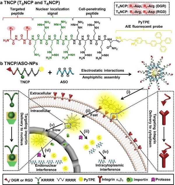基因干扰疗法(也称为基于寡核苷酸的疗法)可以在哺乳动物细胞中稳定地沉默或抑制序列特异性基因的表达。其在病原体、癌症和代谢疾病的治疗中获得了显著的成果。在基于寡核苷酸的疗法中,反义单链DNA寡核苷酸(ASO)疗法和RNA干扰(RNAi)在过去几十年中在胞质内和内核干扰方面取得了显著成果。然而,由于负电荷和核苷酸易于酶促降解以及生物体的多种生物屏障的限制,基于寡核苷酸的疗效受到严重阻碍。