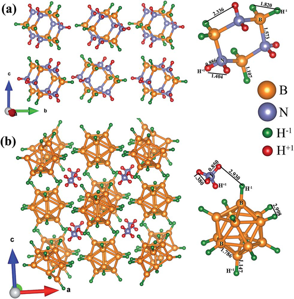 (a,b)分别为(BH2NH2)3和(NH4)2(B12H12)的晶体结构。正氧化态和负氧化态的氢分别用红色和绿色表示。键长以Å表示。