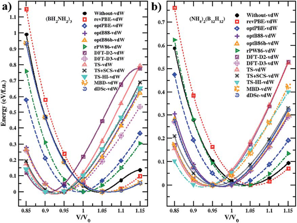 近日,在印度泰米尔纳德邦中央大学P. Ravindran教授团队(通讯作者)带领下,与挪威奥斯陆大学合作,基于(BH2NH2)3和(NH4)2(B12H12)的高体积密度,被视为潜在的储氢材料,团队设想对(BH2NH2)3和(NH4)2(B12H12)体系中各组分之间的化学键进行研究,解释氢存在的两性状态。为了理解范德华相互作用对结构参数的影响,团队考虑了12种不同的vdW修正泛函,发现optPBE-vdW函数可靠地预测平衡结构参数,误差小于0.009%。因此,利用optPBE-vdW函数计算电荷密度、电子局域函数、总态密度和分态密度、Bader和Born有效电荷等。观察到,氢在带负电荷的状态下,H更接近B,而在带正电荷的状态下,H更接近N时,表现出两性行为。相关成果以题为“Amphoteric behavior of hydrogen (H+1 and H−1) in complex hydrides from van der Waals interaction-including ab initio calculations”发表在了J. Mater. Chem. A上。