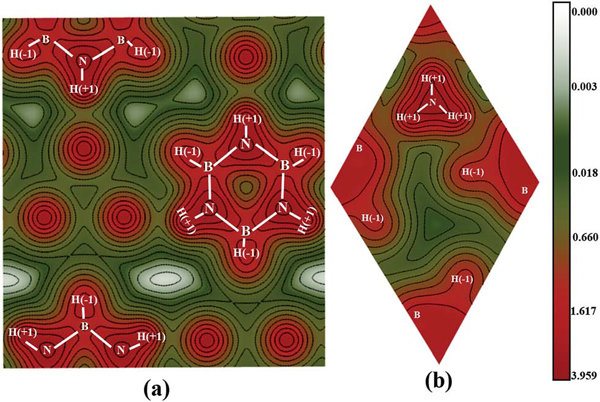 (a) (BH2NH2)3和(b) (NH4)2(B12H12)中计算出的价电子密度分布。电子密度(单位为e/Å3)被投影到一个平面上,这个平面上有B-H和N-H键。