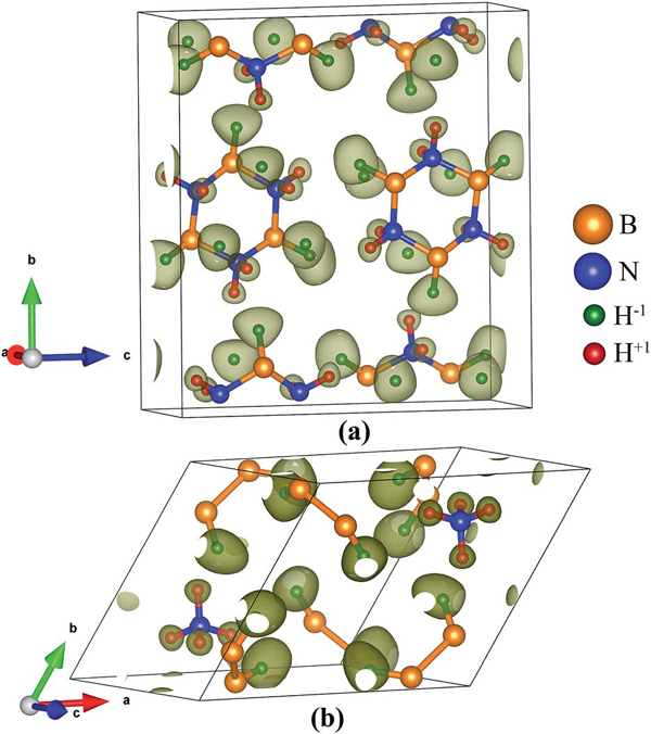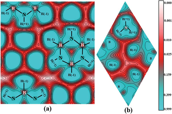 (BH2NH2)3和(NH4)2(B12H12)的电子局域函数(ELF)为optPBE-vdW函数计算得到的。在B-H和N-H键的平面上显示了ELF分布。