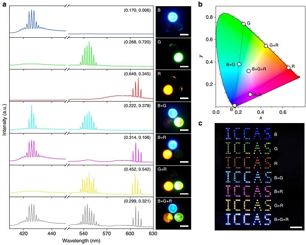 (c)由不同RGB微半球组成的像素阵列的“ICCAS”图案的远场照片。