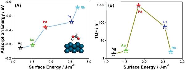 A) 不同金属表面能与HCOOH吸附能之间的关系,插图为HCOOH在Pd(111)上的吸附构型, Ag、Au、Pt、Rh(111)表面与之相似,绿色、灰色、白色和红色原子分别表示Pd、C、H和O;