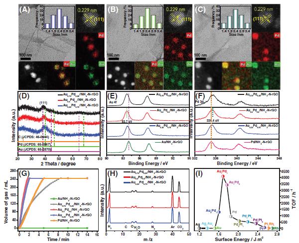 A) Au0.25Pd0.75/NH2-N-rGO的TEM图像,插图为相应的尺寸分布图、HRTEM图像、HADDF-STEM图像以及相应的Au和Pd的元素分布(下同);