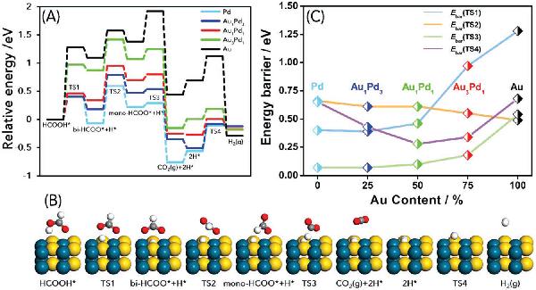 C) 催化剂的Au含量与各反应步骤能垒的关系,TS1为O-H键断裂步骤,TS2为bi-HCOO*重排步骤,TS3为C-H键断裂步骤,TS4为H2生成步骤。