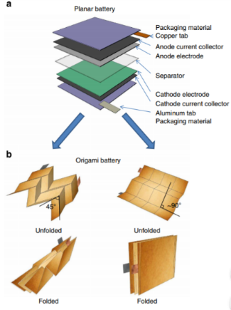 折纸,是折或叠纸张的艺术,把纸张折出特定的形状和花样,只需要透过折叠的技巧就可以创造出复杂精细的设计。通过折叠,弯曲等将2D维度的纸折叠成3D空间的多种形状。而将折纸技术应用到平面的锂离子电池中又迸发了什么样的火花呢?2014,亚利桑那州立大学的Jiang 研究小组将集流体、正极、负极、隔膜和封装材料按照两种不同折角折叠组装,当拉伸,弯曲时,因为折叠的作用,电池能够承受很大的应力,有很好的弹性,将电池多次折叠后仍然保持很好的循环容量 [2]。