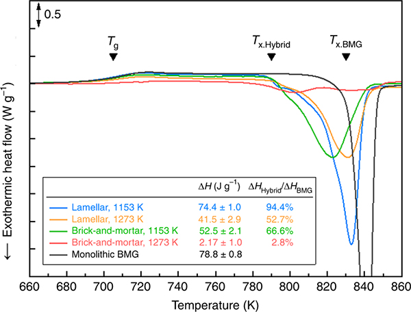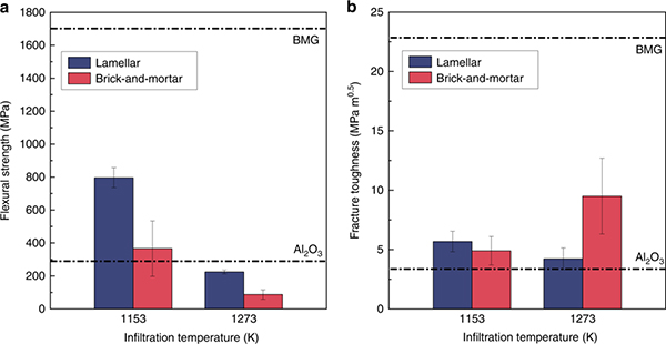 近日,首尔国立大学Eun Soo Park 教授与加州大学、劳伦斯伯克利国家实验室Robert O. Ritchie教授合作,成功合成了仿珍珠质的氧化铝结构,该结构中含有玻璃合金作为兼容相。通过接触角测量和静电悬浮证实了陶瓷支架的长度尺度及其对液态合金的优异润湿性。Zr基块状金属玻璃在氧化铝上能够几秒内完全润湿,表明两种材料在界面处发生了共形结合。最后本文还考察了加工条件对陶瓷-金属界面的影响。该成果以题为” Bioinspired nacre-like alumina with a bulk-metallic glass-forming alloy as a compliant phase “发表在国际著名期刊Nature Communications上。