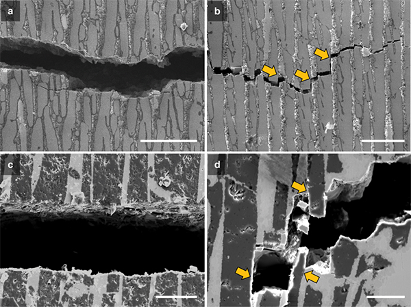 (c, d) 与浸润在1273K中的样品相比,浸润在1153K中的实体结构样品显示出较少的裂纹偏转行为。
