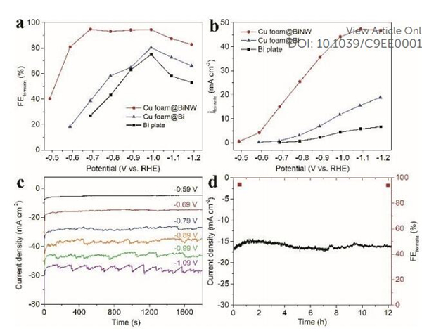 CO2电催化性能测试结果表明,在低过电位下,Cu foam@BiNW能够实现CO2到甲酸的高效转化,在-0.69 V vs. RHE的电位下能够达到甲酸盐(FEformate)的法拉第效率为95%,甲酸盐的电流密度达到~15 mA cm-2。在-0.69 V至-0.99 V范围内,FEformate值也能够保持在93%以上。相对于铋片以及铋膜包覆的泡沫铜,Cu foam@BiNW都表现出了更高的选择性,更低的过电位,以及更大的催化电流密度,如图3a,b所示。Cu foam@BiNW也能够在不同的外加电压下保持稳定的催化电流密度(图3c)。在为时12小时的长时间点解测试中,Cu foam@BiNW的催化效能亦能保持稳定(图3d)。