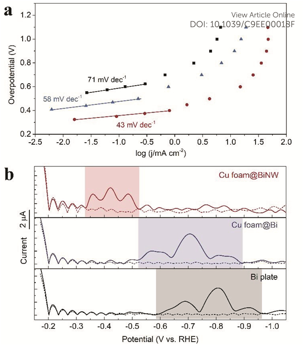 文献链接:Formation of Lattice-dislocated Bismuth Nanowires on Copper Foam for Enhanced Electrocatalytic CO2 Reduction at Low Overpotential(Energy and Environmental Science, 2019, DOI: 10.1039/C9EE00018F)。