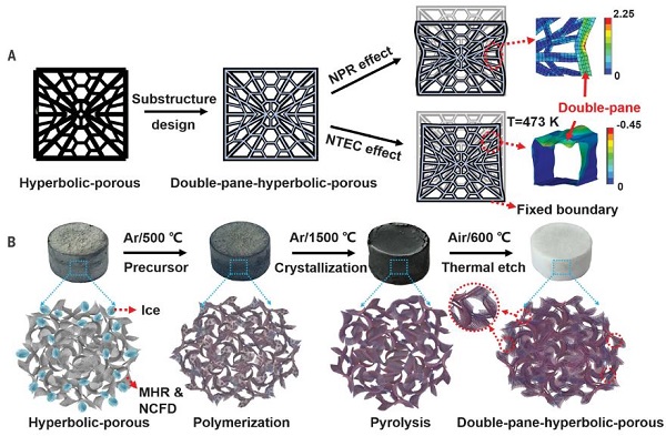 近期,哈尔滨工业大学的李惠研究员和加州大学洛杉矶分校的黄昱、段镶锋(共同通讯作者)等人利用三维石墨烯气凝胶模板设计合成了同时具有强大的机械和热学稳定性的氮化硼(hBNAGs)以及碳化硅(βSiCAGs)陶瓷气凝胶材料。这类陶瓷材料由纳米层状双窗格壁组成,整体呈现出超低密度的双曲线构造形态。而这一特殊结构赋予材料负泊松比(-0.25)以及负线性热膨胀系数(-1.8×10-6/℃),致使材料维持热稳定性的同时依然能表现出优异的可变形性和断裂韧性。在剧烈的热休克(大约275℃/s)以及长期高温暴露过程中,这类材料表现出优异的热稳定性以及几乎为零的强度损失。同时此种气凝胶还表现出超低的热导率(在真空中约为2.4 mW/m·K,在空气中约为20 mW/m·K),因此研究人员认为基于上述新型陶瓷气凝胶可以设计理想的超级隔热系统并在航天器等领域有所应用。2019年02月15日,相关成果以题为“Double-negative-index ceramic aerogels for thermal superinsulation”的文章在线发表在Science上。