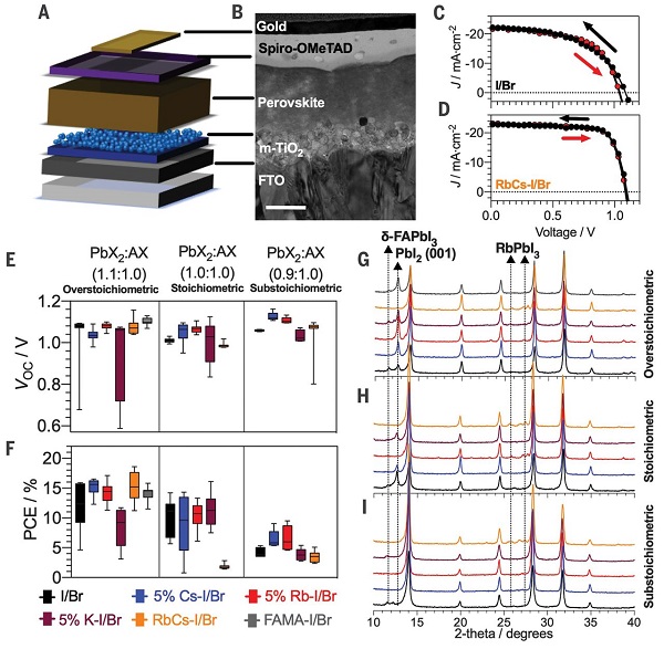 目前已录得最高转换效率的铅卤钙钛矿太阳能电池(PSCs)是由混合的甲胺等有机阳离子和混合的溴、碘等卤素阴离子制备形成的。研究人员发现,调控有机/无机离子的化学计量数是实现高效光电流的关键。然而,前驱体的化学计量数的调控以及碱金属的引入对改善材料性能、稳定性等方面的机理探索依然还处在起步阶段。