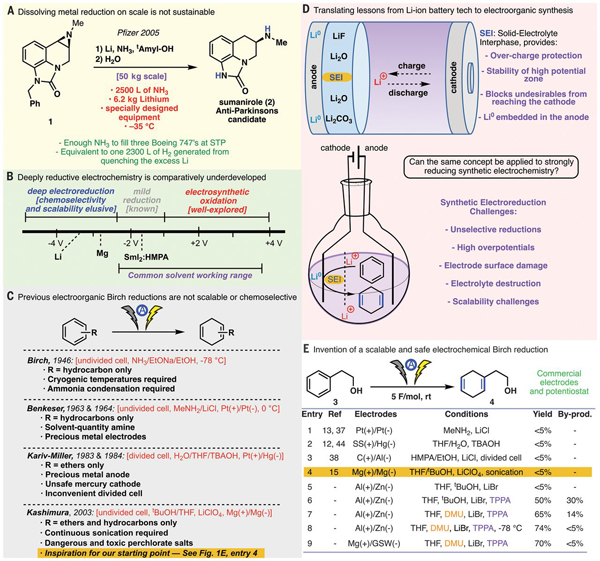 在美国斯克里普斯研究所Byron K. Peters教授和Kevin X. Rodriguez教授团队(通讯作者)的带领下,与美国犹他大学、美国辉瑞全球研发中心、凯莱英生命科学技术(天津)有限公司和明尼苏达大学合作,展示了几十年来对锂离子电池材料、电解质和添加剂的研究如何为实现伯奇还原的实际可扩展的还原电合成条件提供灵感。具体来说,团队证明使用牺牲阳极材料(镁或铝),结合廉价,无毒,水溶性质子源(二甲基脲),以及受电池技术启发的过充电保护剂[三(吡咯烷基)磷酰胺],可以进行大规模的药物相关结构单元的合成。团队还展示了相对于传统的电化学和化学溶解金属还原,官能团在这些条件下如何具有非常高水平的耐受性。最后,团队证明了相同的电化学条件可以应用于其他溶解金属型还原转化,包括McMurry偶联,还原酮脱氧和环氧化物开环。相关成果以题为“Scalable and safe synthetic organic electroreduction inspired by Li-ion battery chemistry”发表在了Science上。