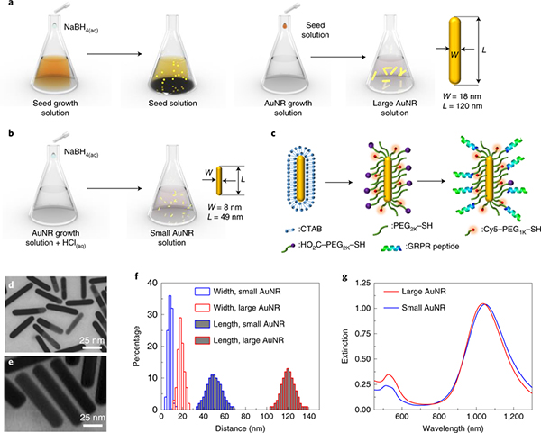 (c) 用于靶向前列腺癌细胞GRPR的AuNR表面功能化的示意图;