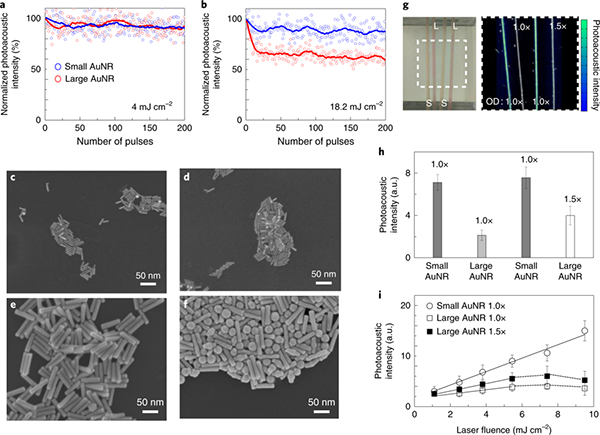 本文中,作者合成了一种在1064 nm处产生吸收的最小金纳米棒,并且发现在纳秒激光照射下,小尺寸金纳米棒的热稳定性是大尺寸金纳米棒的3倍。更重要的是,通过简单地减小尺寸而不改变纳米粒子的光学吸收就能够增加纳米粒子的光声量子产率,从而使得光声信号增强超过3.5倍。在体内整体肿瘤光声信号的显著改善4.5倍。这些发现为未来光声分子造影剂的设计提供了策略,并可能在NIR-II窗口中激发更多的光声分子成像应用。