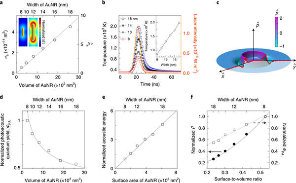(d) 归一化的光声量子产率与纳米颗粒体积的函数关系;