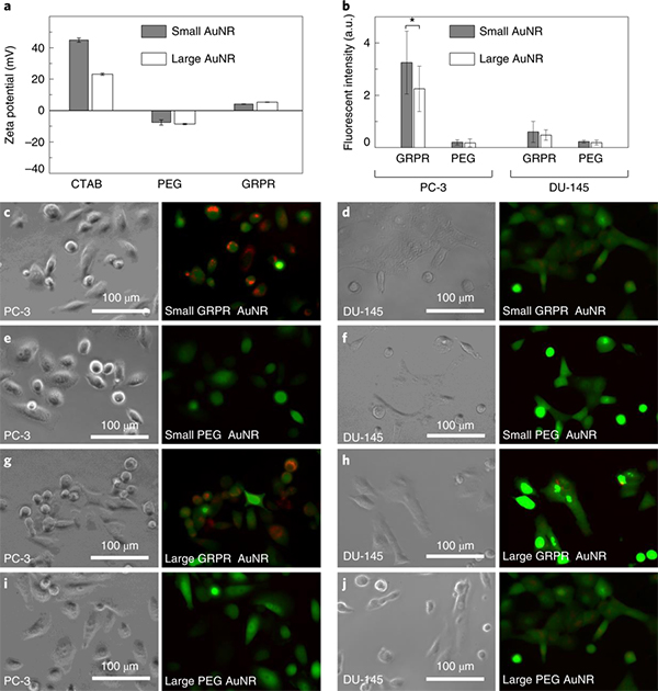 (j) 与大PEG AuNR一起孵化的DU-145 细胞的明场(左)和荧光(右)图像。
