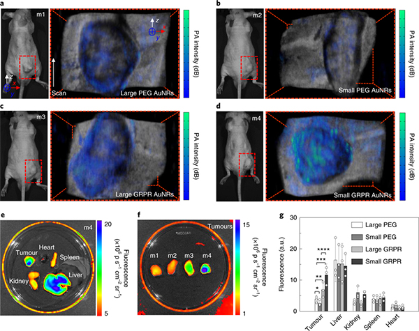 (d) 带有靶向小AuNRs的荷瘤小鼠的照片(左)和光声成像(右);