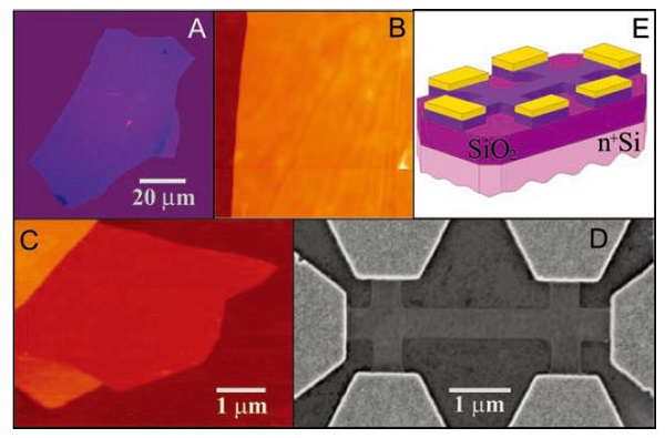 (A)厚度为3nm左右的多层石墨烯片(B)石墨烯片边缘附近的AFM图像(C)单层石墨烯的AFM图像(D)石墨烯薄膜基多终端Hall Bar器件的SEM图像(E)石墨烯薄膜基多终端Hall Bar器件示意图[2]