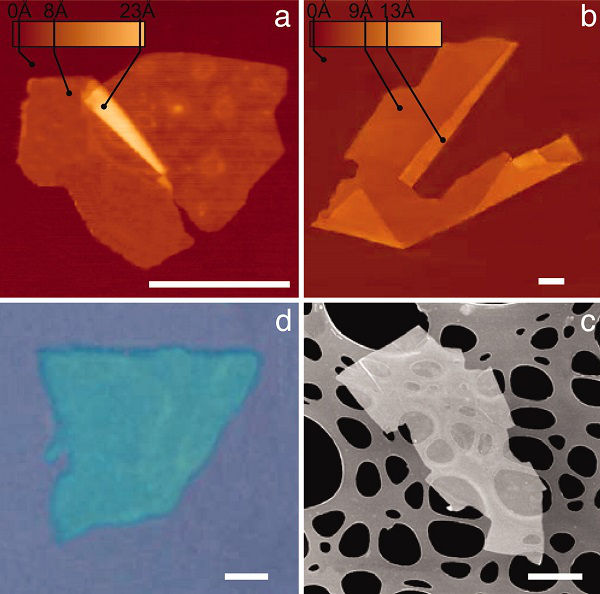 (A)二维硒化铌的AFM图像(B)二维石墨的AFM图像(C)二维Bi2Sr2CaCu2Ox的SEM图像(D)二硫化钼的SEM图像(标尺为1μm)[7]