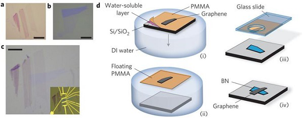 (A)石墨烯光学图像(B)转移前氮化硼的光学图像(C)转移后的氮化硼的光学图像(D)器件制备过程示意图[8]