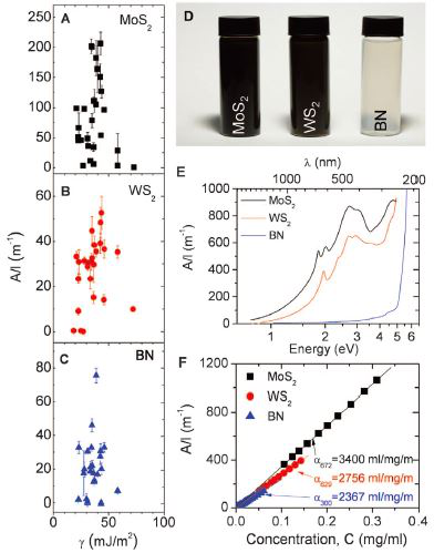 (A)到(C)二硫化钼、二硫化钨以及氮化硼三种层状材料离心后剩余浓度与溶剂表面张力的关系(D)二硫化钼在NMP溶剂中、二硫化钨在NMP溶剂中以及氮化硼在IPA溶剂中的数码照片(E)三种材料分散溶液的吸收光谱(F)三种材料分散液的朗伯-比尔曲线[11]