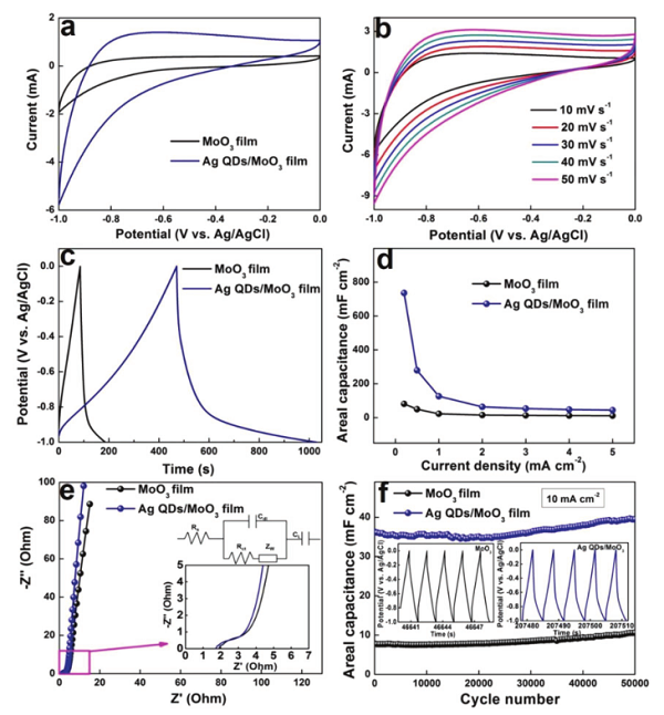 Ag QDs/MoO3和Ag QDs/MnO2薄膜的制备:MoO3纳米线、MnO2纳米线和Ag量子点均采用水热法合成。首先,将25 mg MoO3纳米线(或10 mg MnO2纳米线)分散到50 mL去离子水中,超声处理15分钟,通过真空抽滤,将得到的滤饼在120℃下真空干燥,然后剥离,从而得到直径为40 mm的纸状自支撑薄膜。通过简单的“浸渍、干燥”过程获得Ag QDs修饰的MoO3或MnO2膜:具体过程是将一片MoO3(或MnO2)膜置于培养皿中,加入一定量的分散在环己烷中的Ag QDs溶液直至浸没,并保持浸渍2小时,再在70 ℃下干燥2小时。经过几次浸渍、干燥循环过程后,样品在250 ℃下完全干燥2小时,得到Ag QDs/MoO3或Ag QDs/MnO2薄膜。固态非对称超级电容器的制备:固态非对称超级电容器采用AgQDs/MnO2薄膜作为正极,Ag QDs/MoO3薄膜作为负极,Na2SO4/PVA凝胶作为电解质,在组装超级电容器之前,首先将电极(没有任何粘结剂和导电添加剂的Ag QDs/MoO3和Ag QDs/MnO2薄膜)和隔膜浸泡在凝胶电解质中2小时,使用不锈钢片作为集流体将由隔膜分开的两个电极组装在一起,或使用Ni泡沫作为柔性集流体,并用paraffin膜密封得到柔性器件。