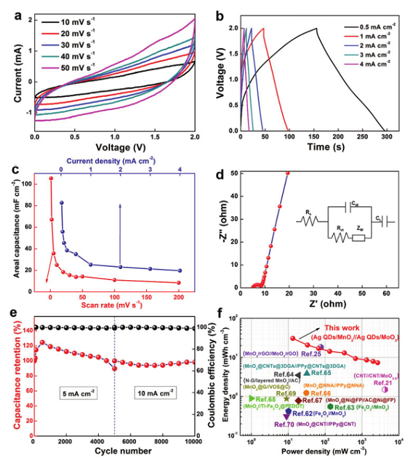 a)CV曲线,扫描速率为20 mV s-1,b)不同扫描速率下Ag QDs/MnO2电极的CV曲线,c)电流密度为0.5 mA cm-2时的GCD曲线,d)面积比电容与电流密度关系图,e)电化学阻抗谱,插图显示用于拟合的电等效电路和高频到中频的局部放大奈阻抗谱,f)循环性能,插图显示最后五次充放电循环曲线。