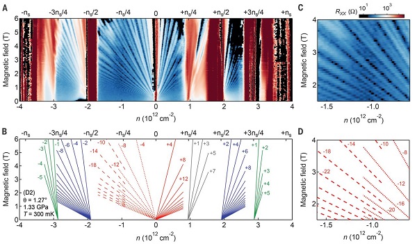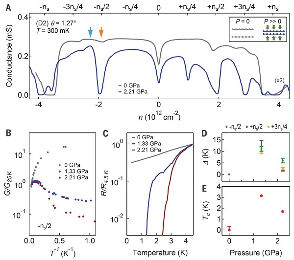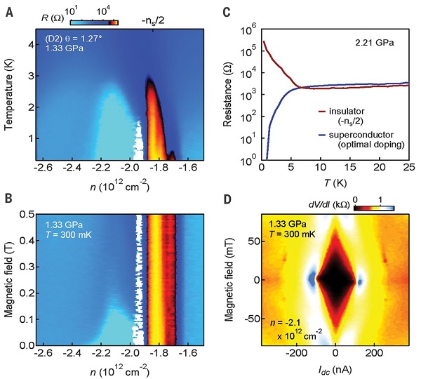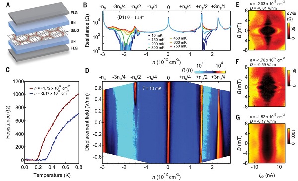 哥伦比亚大学的Cory R. Dean和加州大学圣巴巴拉分校的Andrea F. Young(共同通讯作者)等人在平带条件下测量tBLG中超导与相关绝缘态的关系。研究表明,除了扭转角,还可以采用层间耦合得以精确地调整这些相位。研究人员通过改变层间间距与静水压力的关系,在大于1.1°的扭转角下诱导超导态,而在这个角度上,相关态并不存在。其低无序器件揭示了超导相图与其附近绝缘体之间的关系,该研究结果表明扭曲双层石墨烯为探索相关态提供了一个独特的可调整平台。2019年3月8日,相关成果以题为“Tuning superconductivity in twisted bilayer graphene”在线发表于Science上。