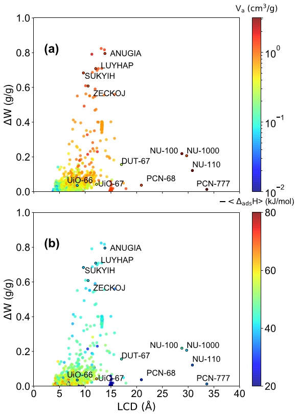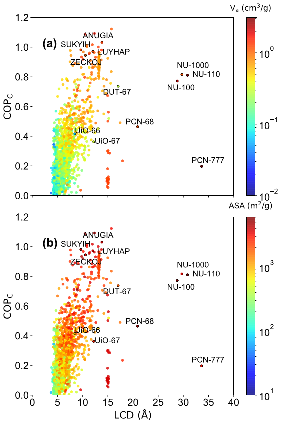 MOFs的吸附性能与其结构特征密切相关。图二展示了MOFs的结构特征[孔径(LCD)和孔容(Va)]和吸附性能[工作吸附量(ΔW)和平均吸附焓(<ΔadsH>)]之间的关系。研究结果表明,孔径在10-15 Å,孔容大于1 cm3/g时,MOFs具有较高的工作吸附量(ΔW > 0.2 g/g )和适宜的吸附焓(40 < -<ΔadsH> < 50 kJ/mol)。根据吸附式热泵的热力学模型,ΔW和<ΔadsH>对制冷性能系数(COPC)具有主导作用,因此推断MOFs孔径在10-15 Å,孔容略大于1 cm3/g时,其制冷性能最佳。