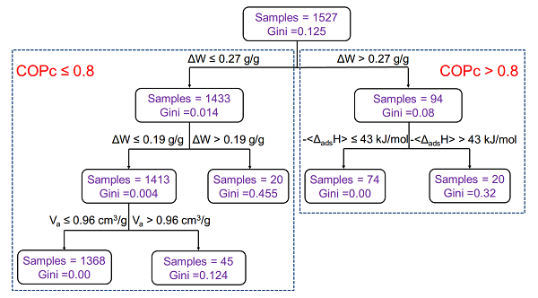 图五. MOFs结构特征、吸附性能与热泵性能的决策树模型分析