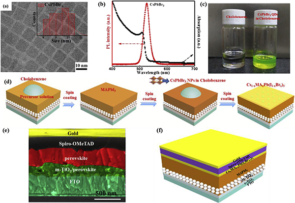有机-无机杂化钙钛矿太阳能电池因其高的光电转换效率及简单廉价的制备工艺,在光伏领域掀起了新的研究热潮,是当前发展最快的新一代薄膜光伏器件。当前,尽管有机-无机杂化钙钛矿电池最高认证效率已经超过23%,然而仍与单结理论极限效率(31%)有着较大差距,同时器件的环境稳定性也严重制约了其商业化应用进程,因此如何在钙钛矿电池中实现效率和稳定性的双赢始终是研究人员的追求目标。已有研究指出该两大关键问题的解决依赖于器件中界面载流子传输和钙钛矿薄膜结晶质量的改善。在本文中,研究人员将CsPbBr3纳米晶通过反溶剂方法引入钙钛矿薄膜中,显著改善薄膜结晶质量,有效抑制了载流子的复合并加快载流子传输,实现了器件效率和稳定性的显著提升。