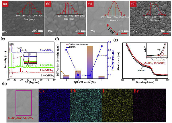 (a-d) 含有不同浓度CsPbBr3纳米晶的钙钛矿薄膜的SEM;