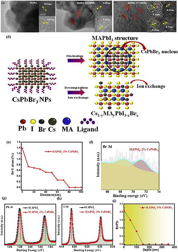 (d) MAPbI3钙钛矿薄膜基于CsPbBr3纳米晶的形核及离子交换示意图;