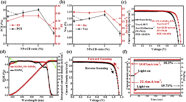 (e) 基于2% CsPbBr3纳米晶浓度的钙钛矿器件的无滞后J-V曲线;