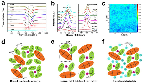 (d-f)稀释电解质(d),浓缩电解质(e)和共溶剂电解质(f)的溶剂化结构