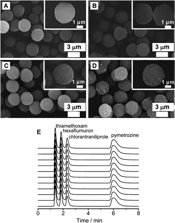 Figure 10.SiO2和ZIF-8@SiO2的SEM表征及其HPLC分离效果