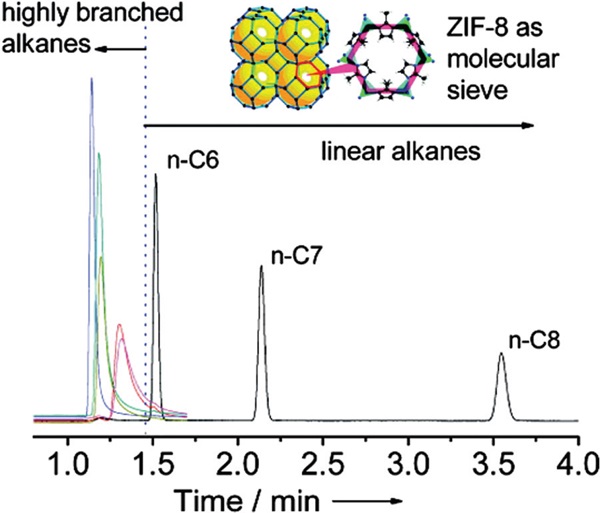Figure 14.ZIF-8涂覆的毛细管用于气相色谱分离支化烷烃和直链烷烃的色谱图