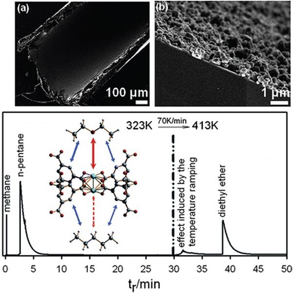 Figure 15.涂覆在GC柱表面的HKUST-1的SEM表征以及分离正戊烷和二乙醚混合物的色谱图