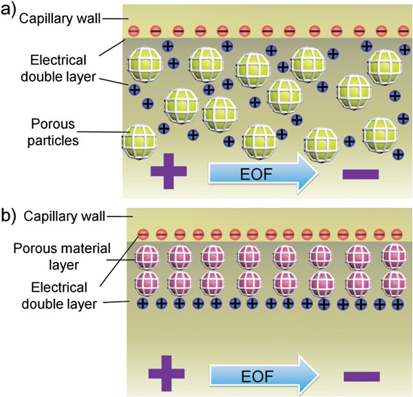 Figure 16.(a)填充型毛细管和(b)开口型毛细管中的电渗流