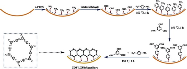 Figure 18.COF-LZU1在醛基官能化毛细管内壁上生长的示意图