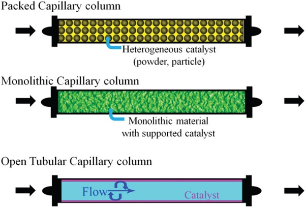 近日,中山大学张建勇教授课题组总结了新兴的多孔材料及其在毛细管柱和微流体装置中作为功能材料在分离和催化等方面的应用。本文涵盖了多孔材料在毛细管柱中的应用,多孔材料在色谱中的应用以及微流体催化和分离膜制造中的应用。实现多孔材料在流动系统中进行分离和催化主要有三种方法,包括多孔材料的填充、柱中整料的开发以及毛细管表面壁上多孔材料的涂覆。除此之外,文章还总结了多孔材料在毛细管柱中的色谱分离、连续流动体系催化合成、空心载体多孔膜中的应用。该成果以题为”Emerging Porous Materials in Confined Spaces: From Chromatographic Applications to Flow Chemistry”发表在Chem. Soc. Rev.上。
