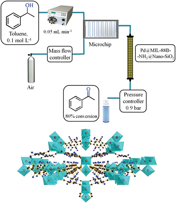 Figure 22.Pd@MIL-88B-NH2@nano-SiO2在连续流动下有氧氧化的装置,以及MIL-88B-NH2的晶体结构