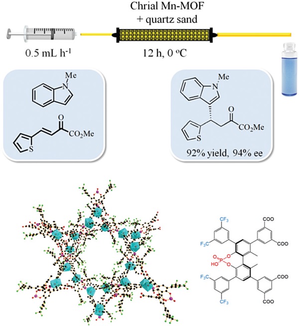 Figure 23.手性Mn-MOF催化的Friedel–Crafts烷基化反应,以及Mn-MOF的X射线结构