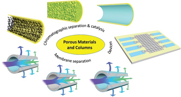 小分子或手性分子(比如药物)的分离在化学和制药工业中的纯化合物生产中具有十分重要的意义。色谱技术和膜分离技术是目前所广泛使用的两种分离技术。他们可以替代高能耗和高成本的方法(比如分馏)来高选择性地对气体或液体混合物进行分离。同时,许多有效的选择性催化剂(包括酶)通常需要固定在固体载体上进行分离和回收。具有较高化学和热稳定性、较大表面积、可调孔隙率和多种功能的先进多孔材料,在化学分离和固定化催化中具有很好的应用。最近,一系列新兴多孔材料已经作为色谱分离的固体固定相、多孔膜基质和用于催化的固体载体受到了广泛地关注。