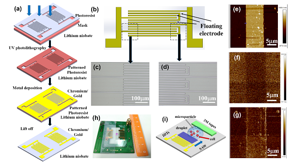 近年来,基于声表面波的微流控技术在细胞分选以及生化传感方面大放异彩。声表面波是一种由射频信号在压电基片上激发的弹性波,其波长处于微米量级,是一种理想的在微纳米尺度进行细胞操控和处理的工具。目前,基于声表面波的微量细胞裂解方法主要是通过声场中的剪切力裂解以及声压裂解来实现,可以在高功率下实现有效的细胞裂解。然而,为获得剪切力需要构建的声子晶体结构制备复杂,而声压破碎又有相当大的功耗以及不稳定性,导致其在进一步集成应用上具有较大限制。因此,如果能够通过引入纳米或者微米量级的颗粒,使其与尺寸相近的细胞进行相互作用,由此产生的相互作用力就有望使细胞在较低的功率下实现裂解,实现低成本的细胞裂解,将会具有非常大的实用意义。