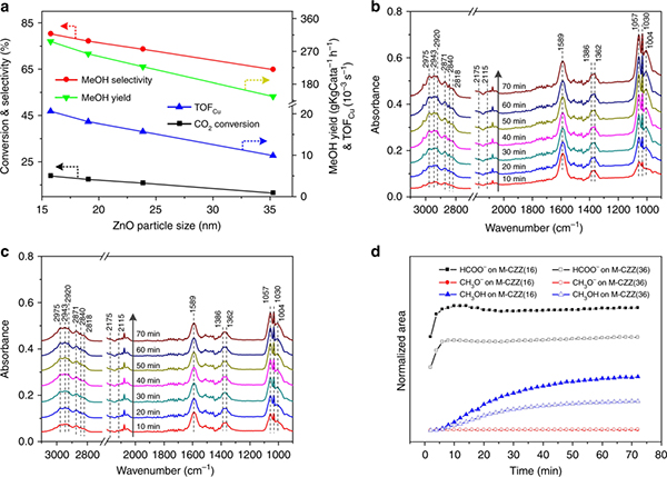(a) CO2转化率、MeOH选择性、MeOH产率和TOF值与不同催化剂中ZnO颗粒尺寸的函数关系;